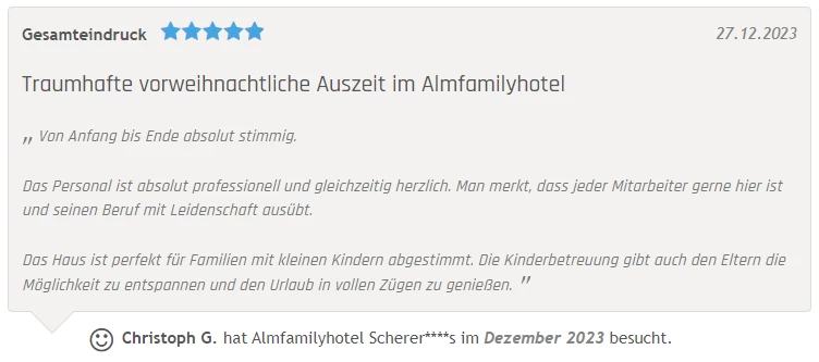 Beim Bewertungsgewinnspiel 2023 wurde die Bewertung von Christoph G. für das Almfamilyhotel Scherer gezogen: