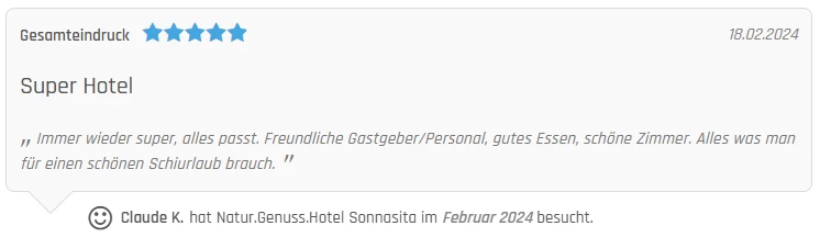 Beim Bewertungsgewinnspiel 2024 wurde die Bewertung von Claude K. für das Natur.Genuss.Hotel Sonnasita gezogen: